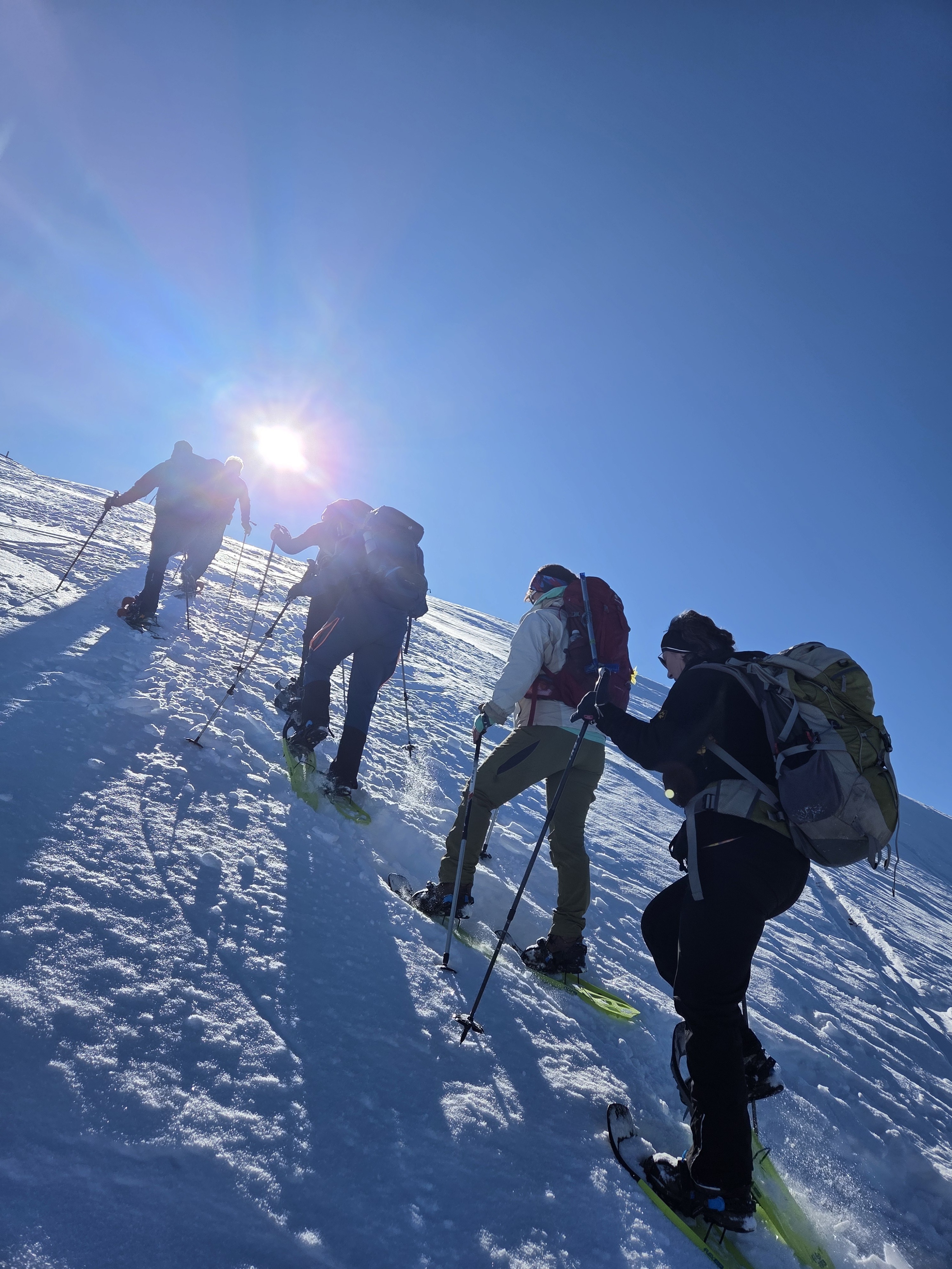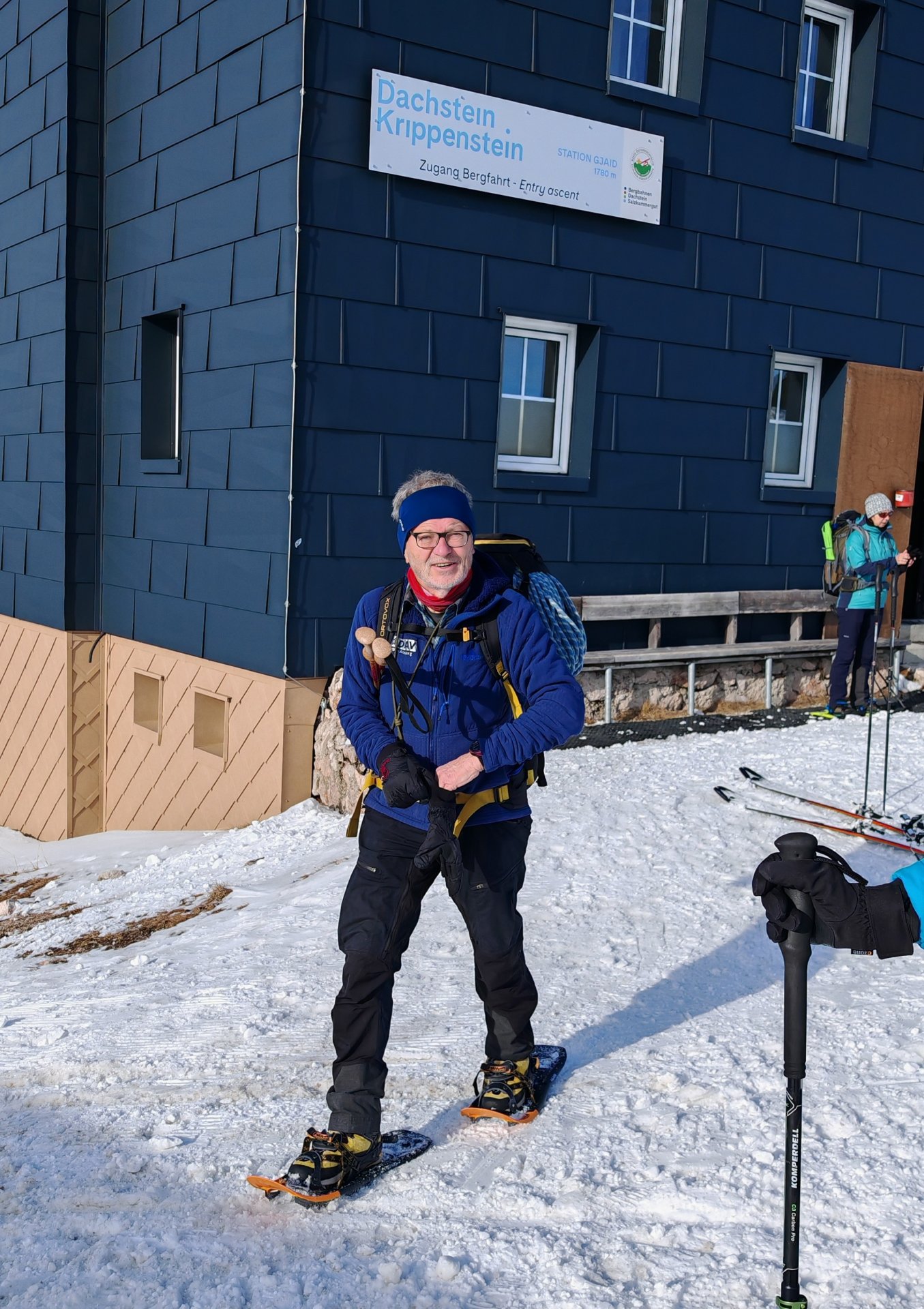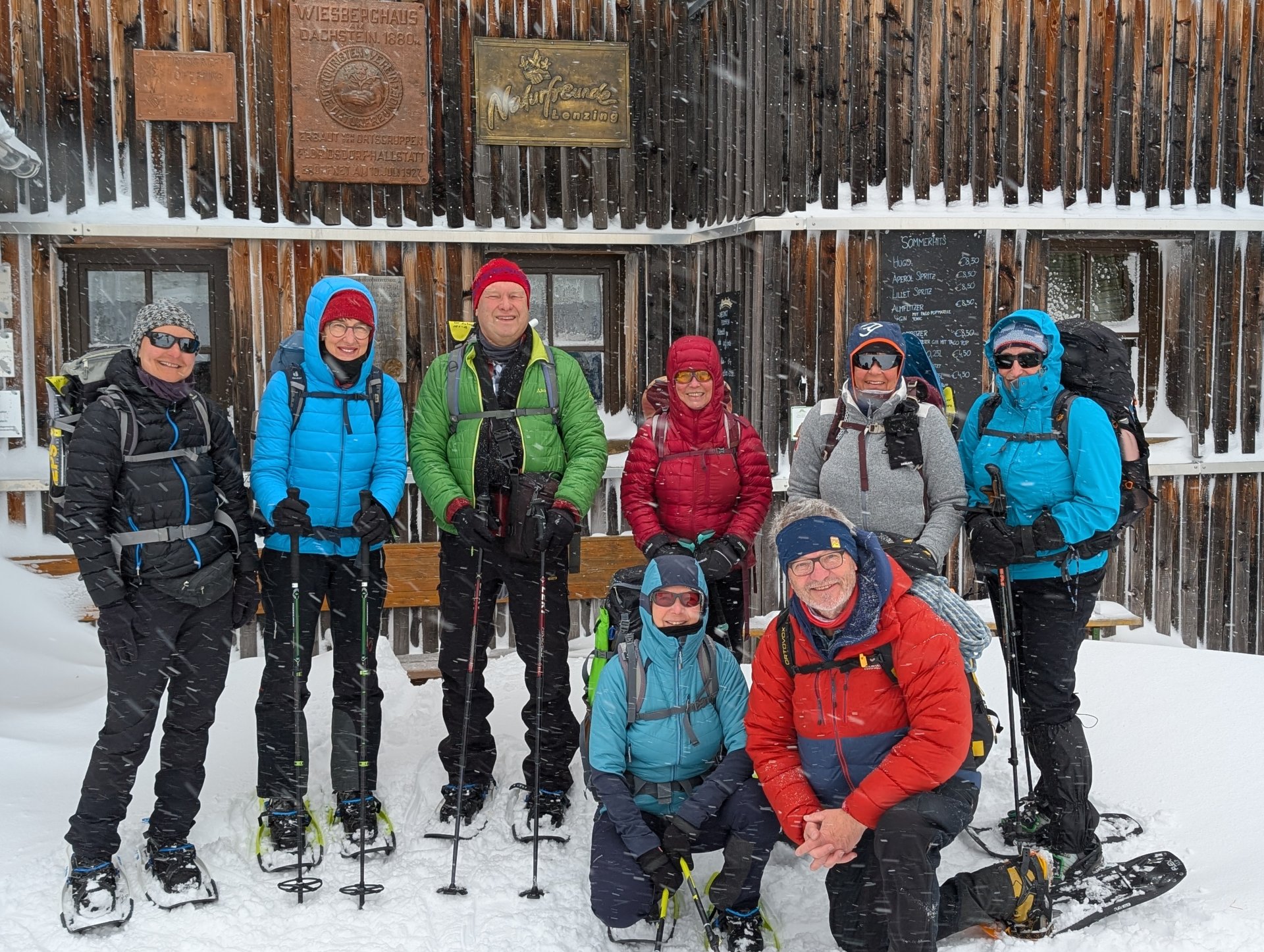Während wir an der Bergstation in der Sonne auf unsere shoppenden Bergführer warteten, verging eine Stunde, bis wir endlich gemeinsam weiter zur letzten Station der Krippenstein-Seilbahn fahren konnten. Dort schnallten wir die Schneeschuhe an – und los ging’s Richtung Wiesberghaus, einer Schutzhütte der Naturfreunde Österreich.