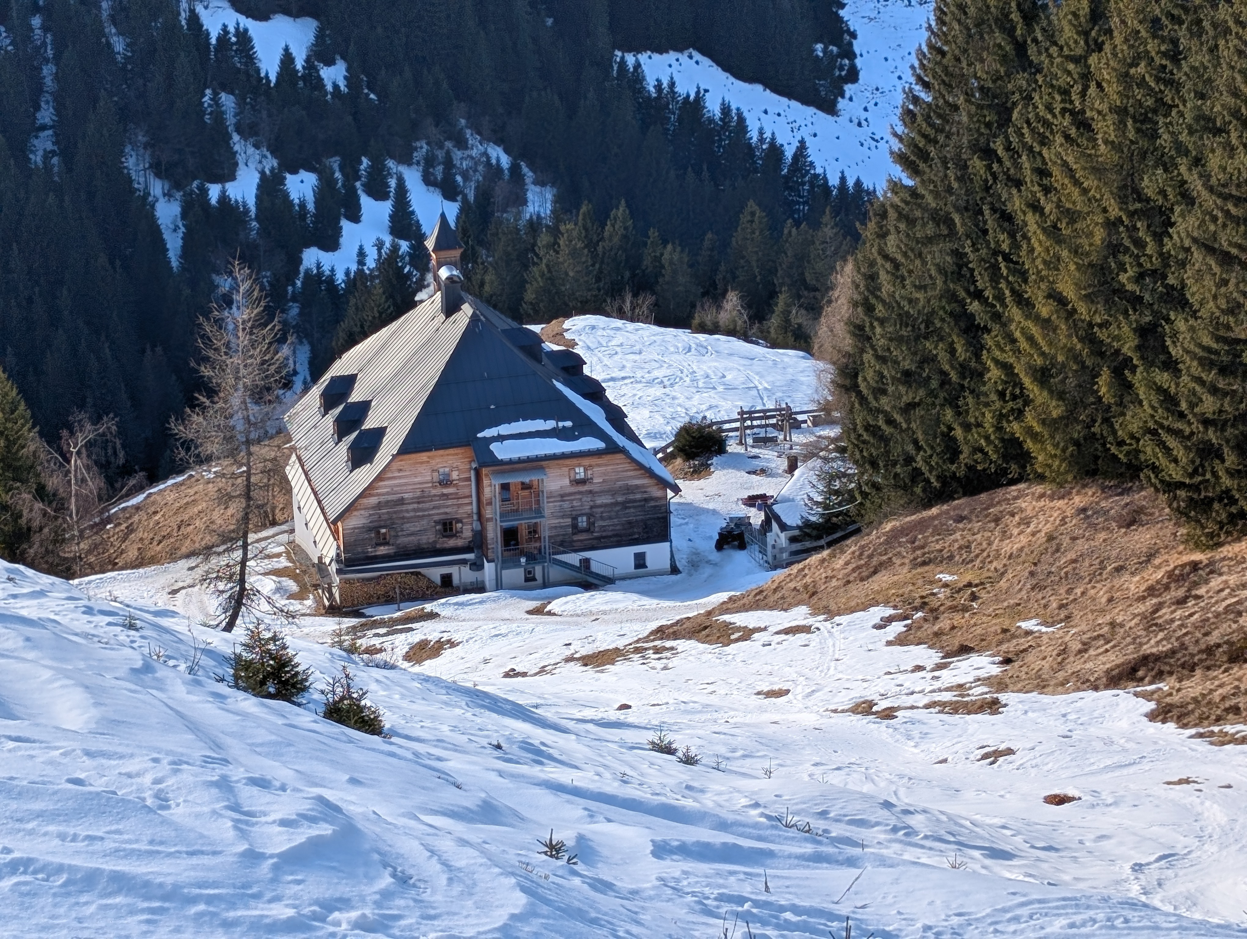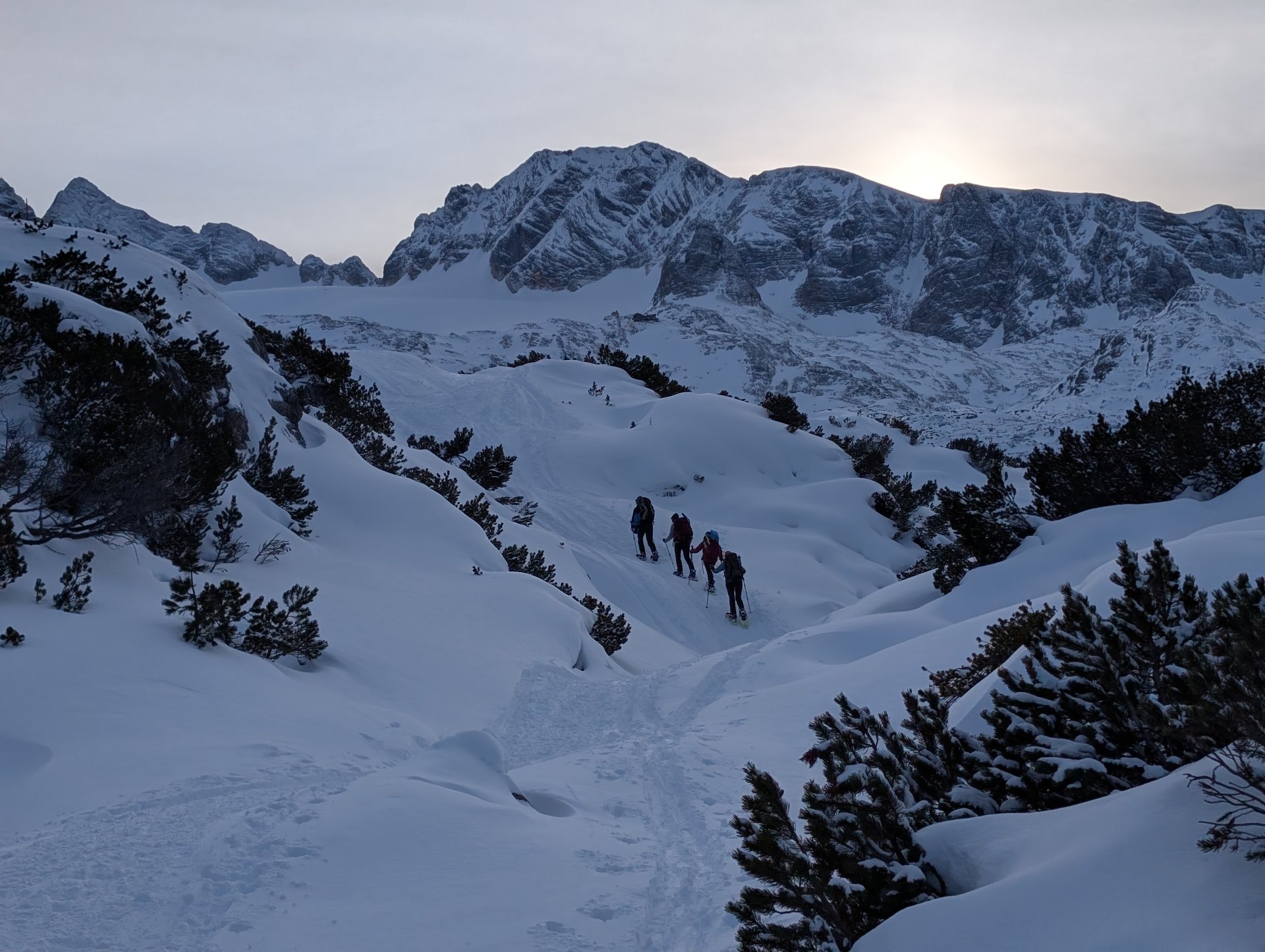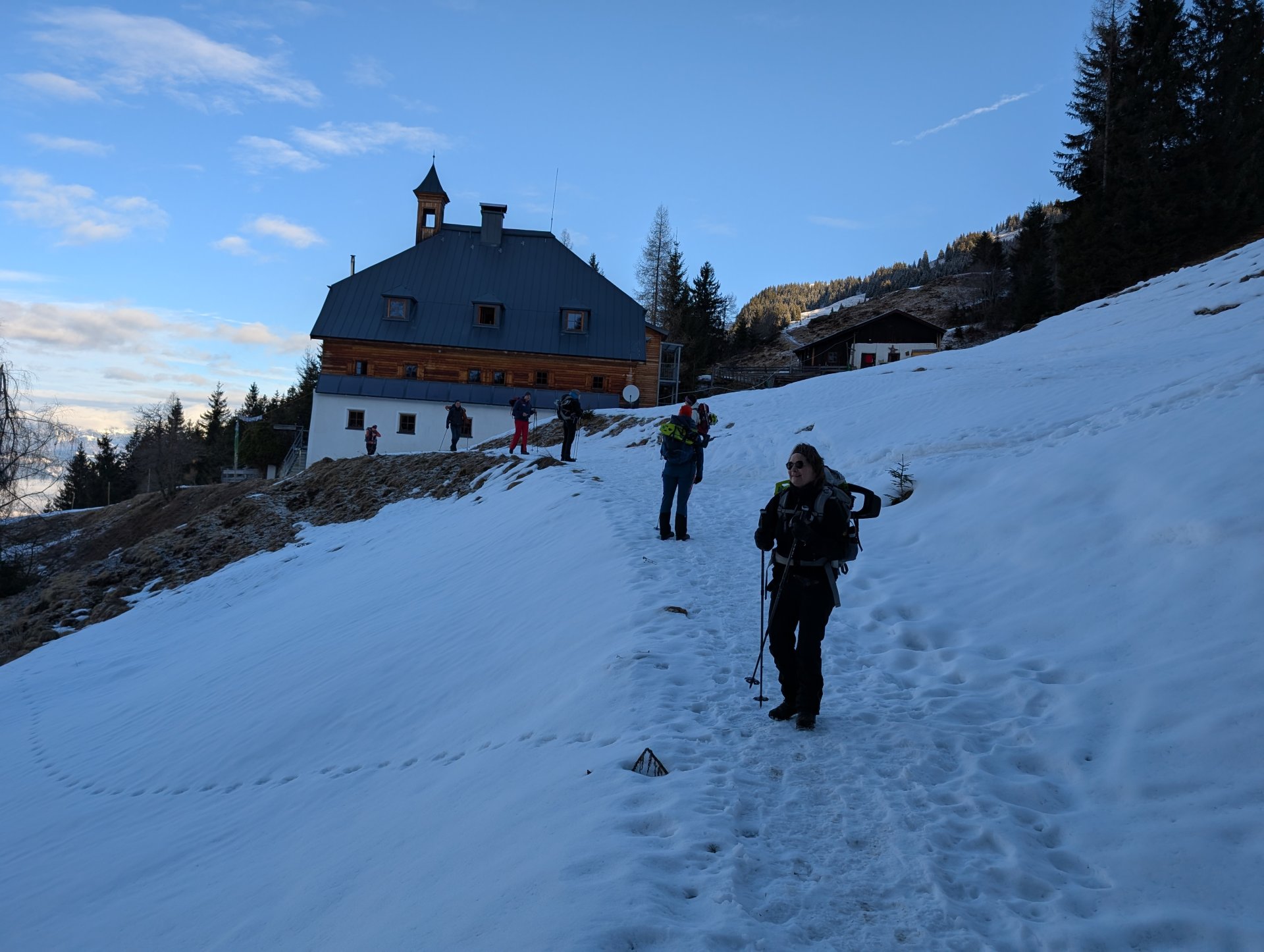 Der Einstieg in den richtigen Winterweg war allerdings nicht ganz leicht zu finden. So kämpften wir uns eine halbe Stunde erstmal durch knietiefen Schnee, bergauf, bergab, querfeldein, bis wir schließlich mit der Dämmerung das Wiesberghaus auf 1872 mtr erreichten.