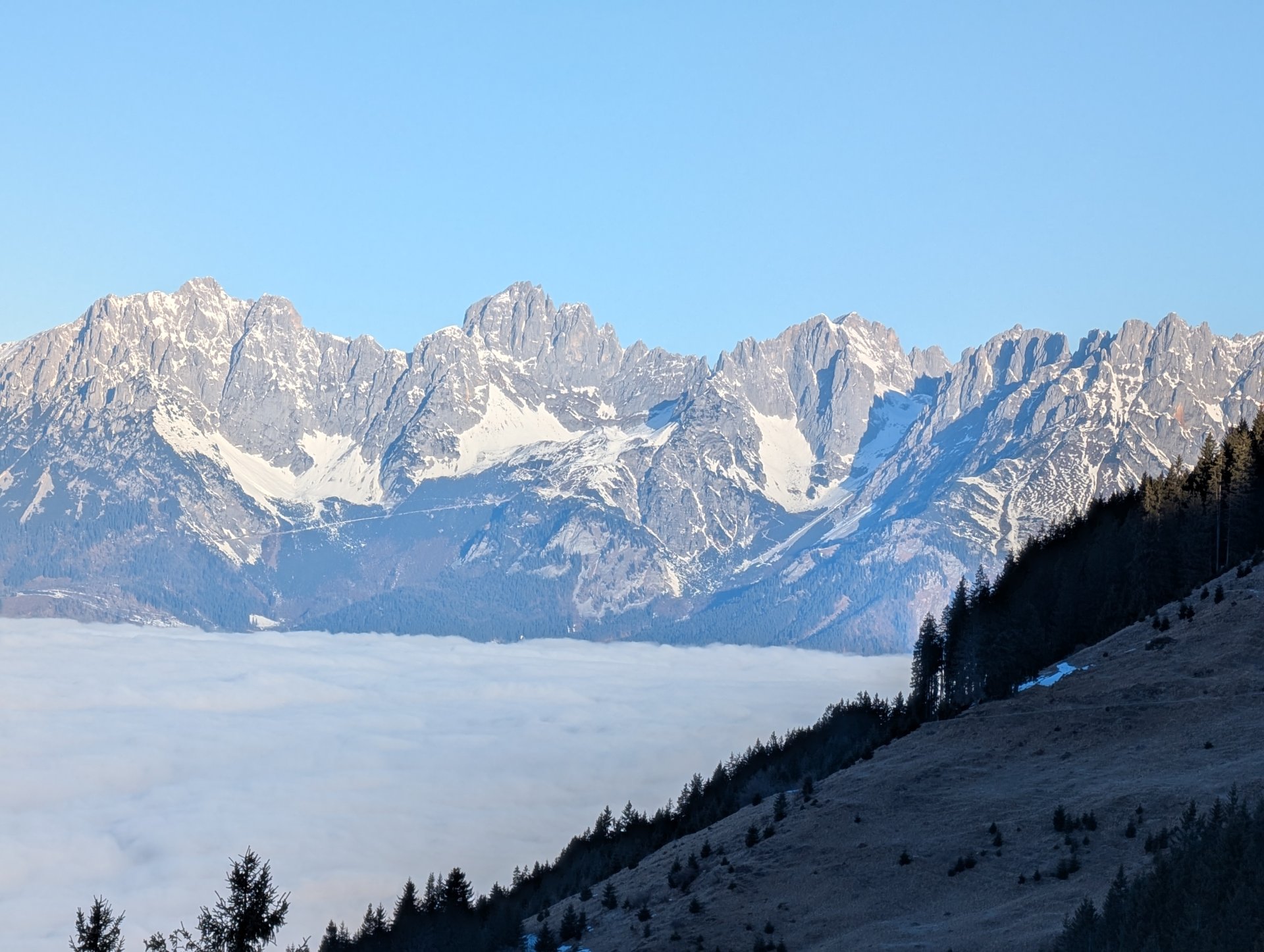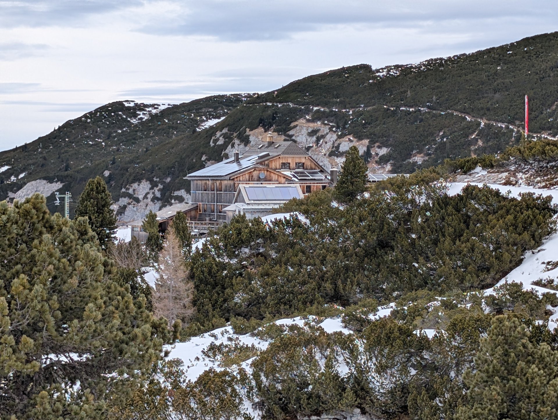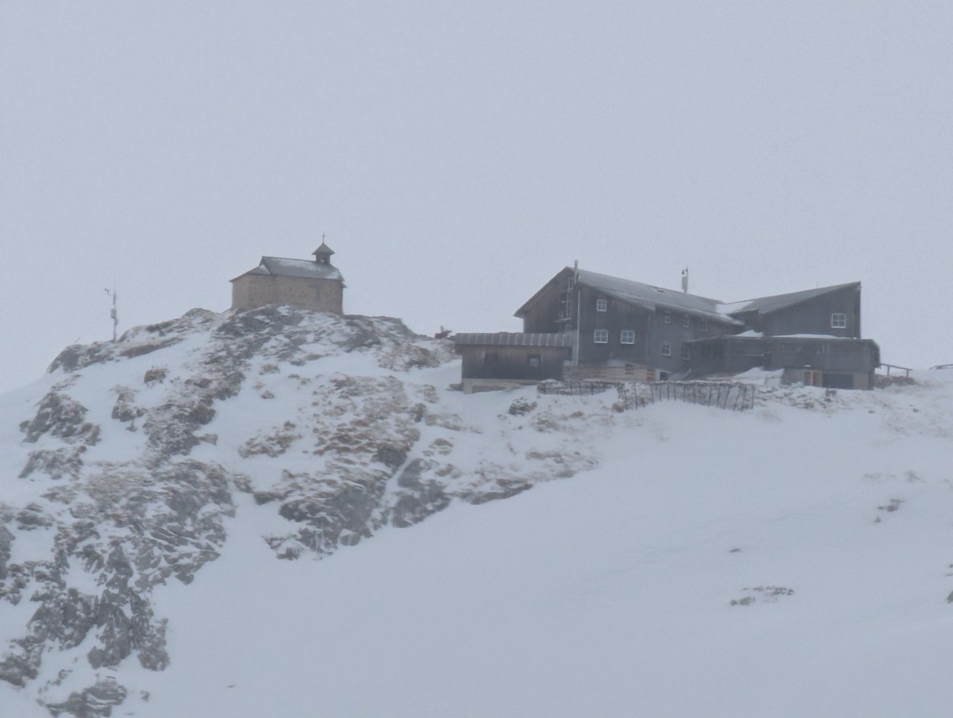 Der Einstieg in den richtigen Winterweg war allerdings nicht ganz leicht zu finden. So kämpften wir uns eine halbe Stunde erstmal durch knietiefen Schnee, bergauf, bergab, querfeldein, bis wir schließlich mit der Dämmerung das Wiesberghaus auf 1872 mtr erreichten.