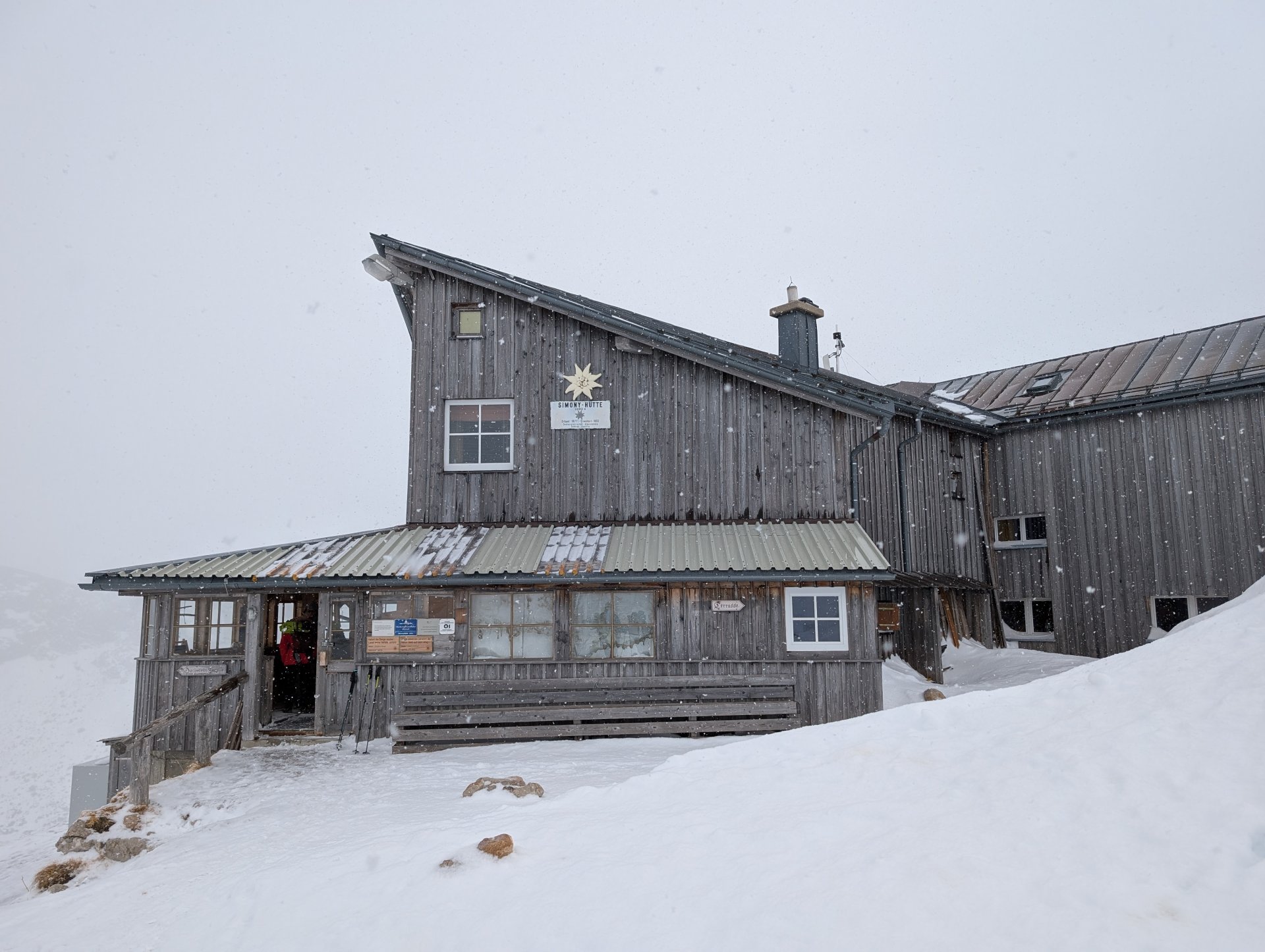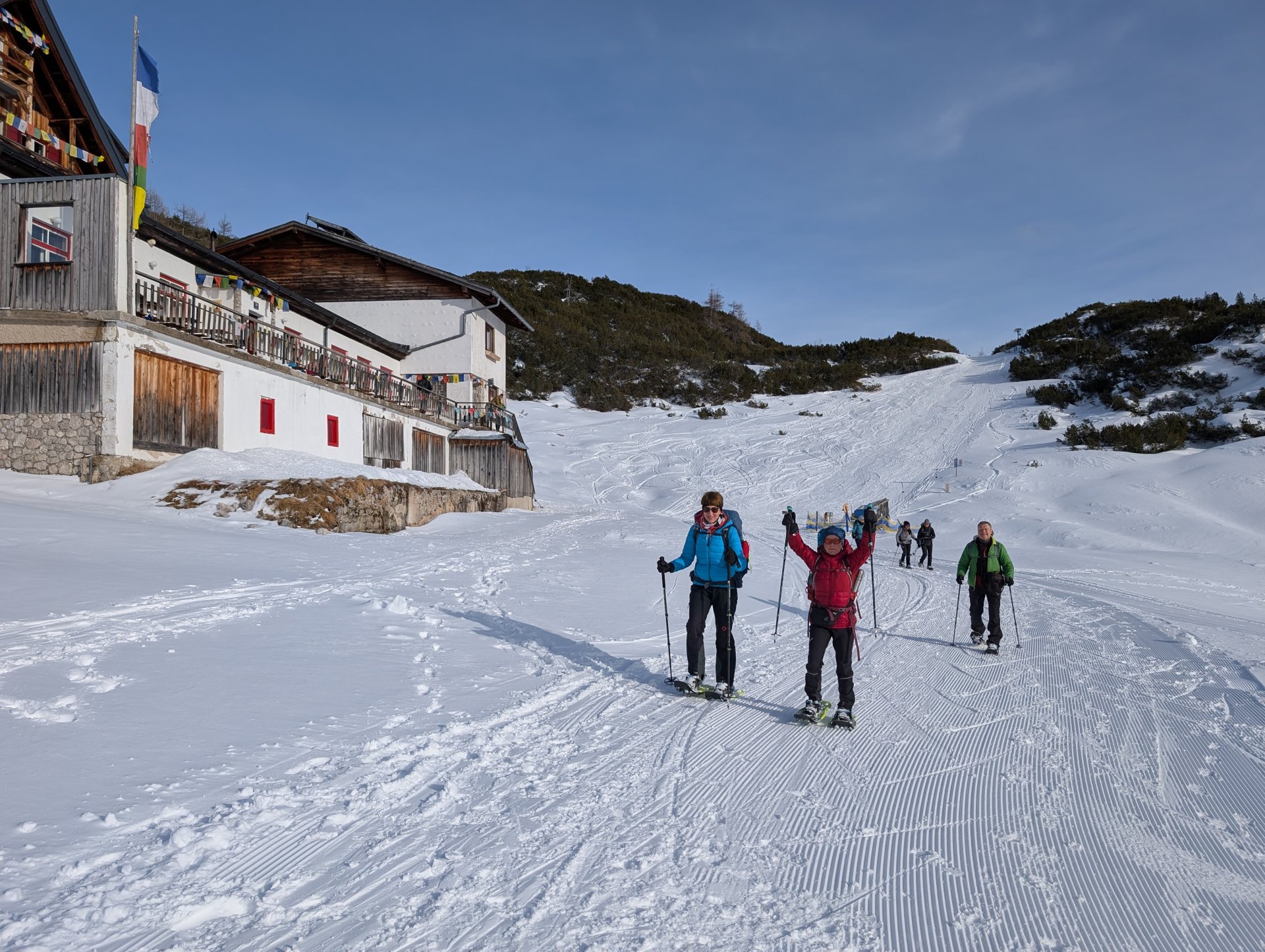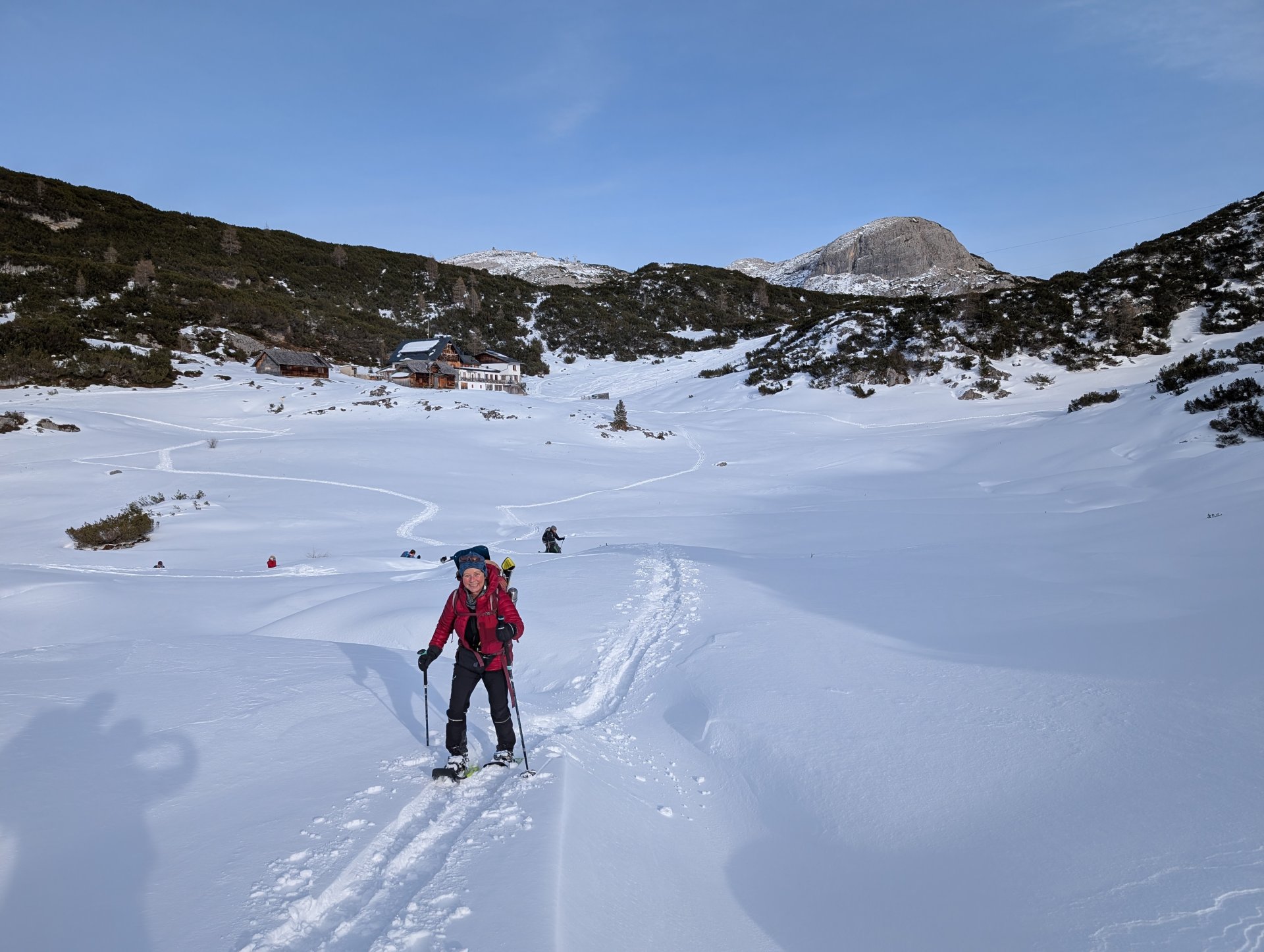Nach einem ausgiebigen Frühstück brachen wir um 9:00 Uhr zur Simonyhütte (2202 m) auf. GeSie und Simone übernahmen das Spuren und kämpften sich mutig durch tiefen Schnee und verschneite Latschenfelder. Kurz vor der Hütte erwartete uns noch eine mit einem Seil abgesicherte steile Passage, die in dem Absturzgelände mit Schneeschuhen echte Akrobatik verlangte.
