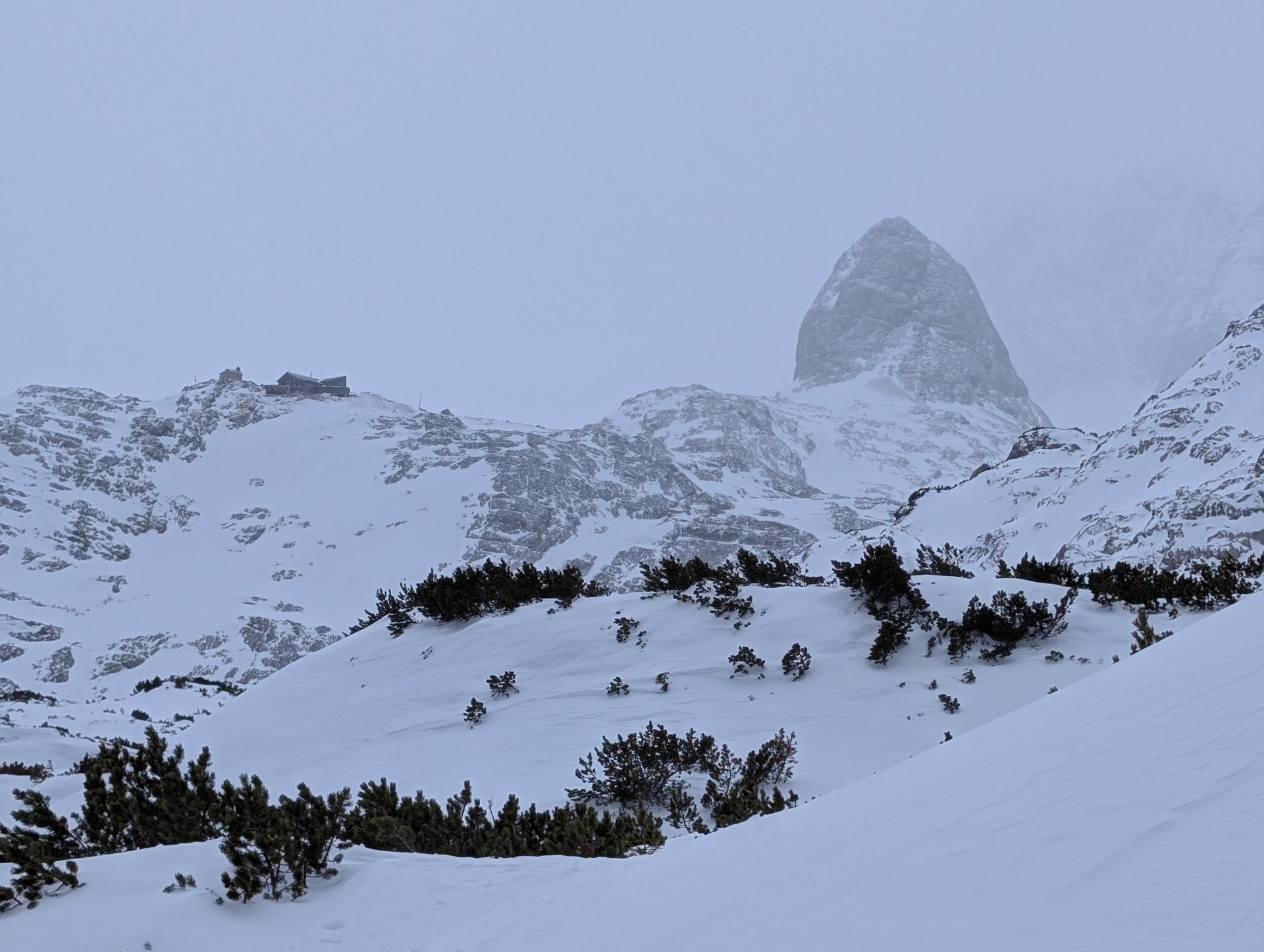 Nach der inzwischen fest eingeplanten Yogaeinheit und dem Frühstück machten wir uns gestärkt auf den Weg zur Gjaidalm. Den ursprünglich geplanten Besuch der Seethaler Scharte am Ende des Hallstätter Gletschers verschoben wir wegen des vielen Neuschnees und auch schlechten Sicht auf nächstes Jahr.