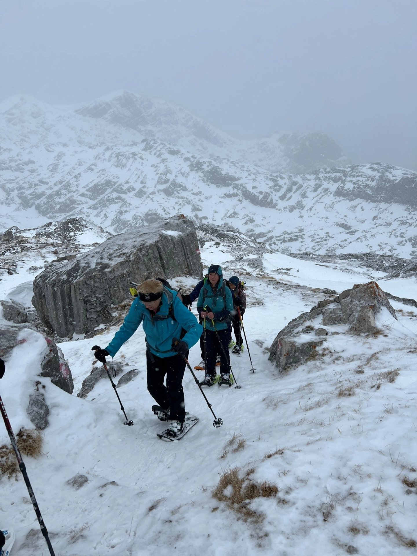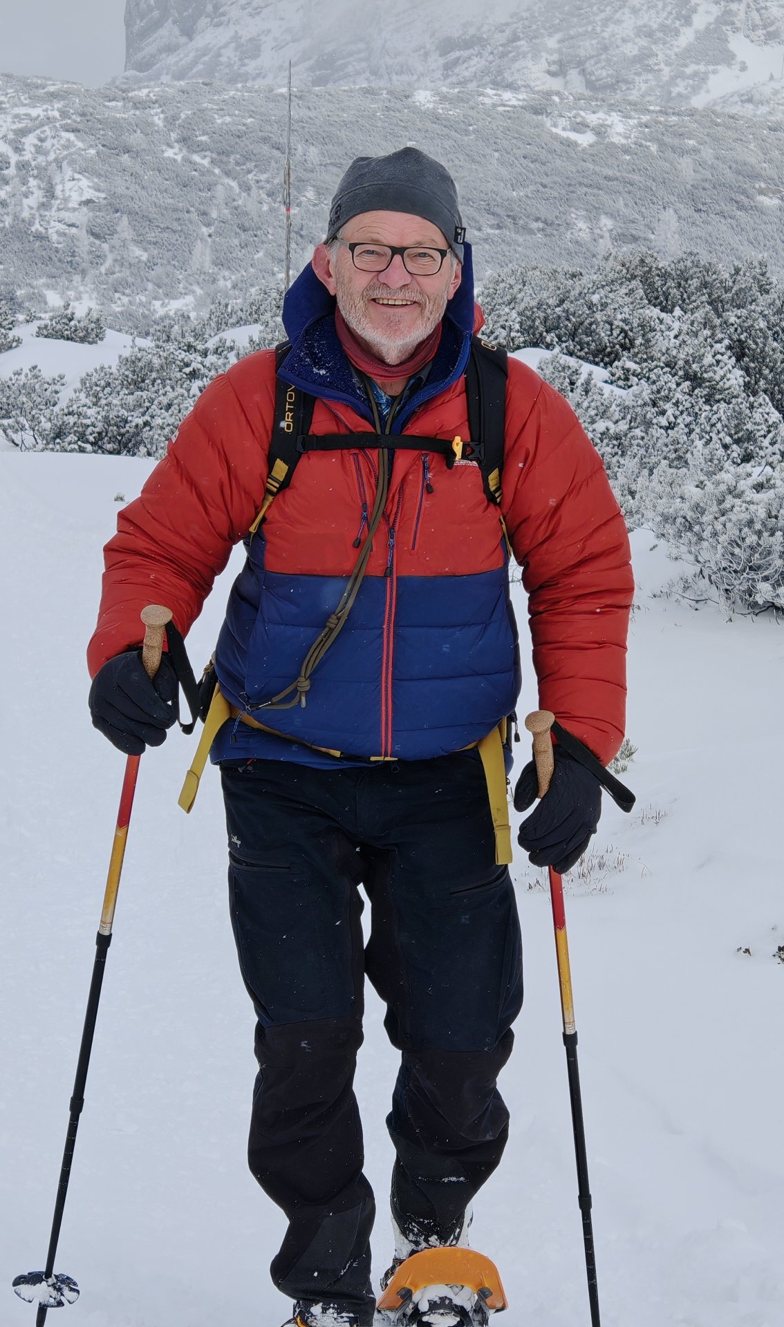 Über Nacht hatte es kräftig geschneit, geschätzt mindestens ein halber Meter Pulverschnee vom feinsten. Nach der opbligatorischen Yogastunde und einem reichhaltigen Frühstück, diesmal sogar mit Frühstücksei, traten wir bei Wind und dichtem Schneetreiben den Rückweg zum Hallstätter See an, diesmal über den Sommerweg. GeSie und Simone spurten unermüdlich und standen dabei mehrfach bis zur Hüfte im Schnee. Am Anfang war die Wegfindung nicht einfach, wir sahen weder Markierungen noch konnte man einen Weg erkennen. Dank der Wander-App fanden GeSie und Simone aber den richtigen Weg.