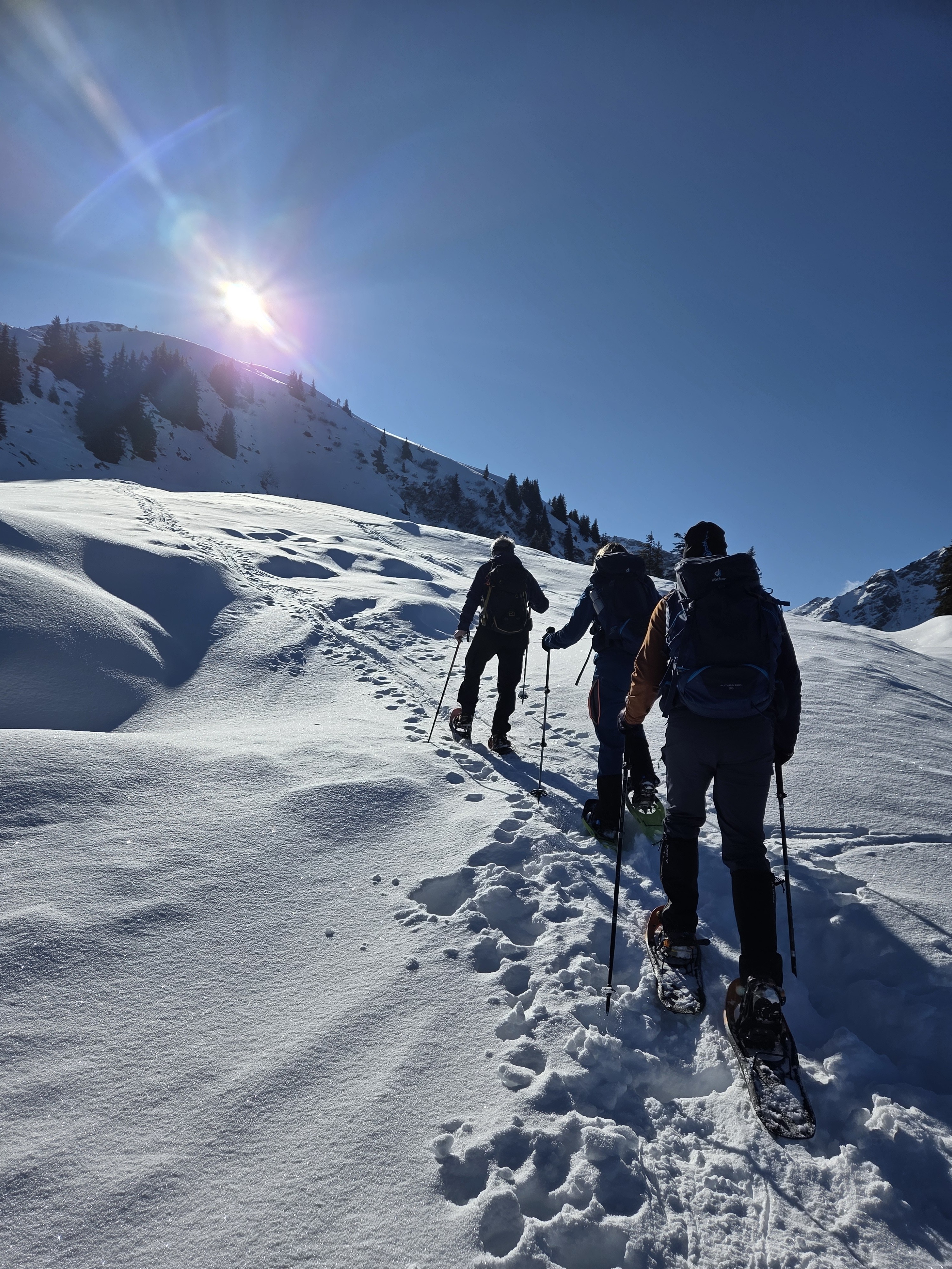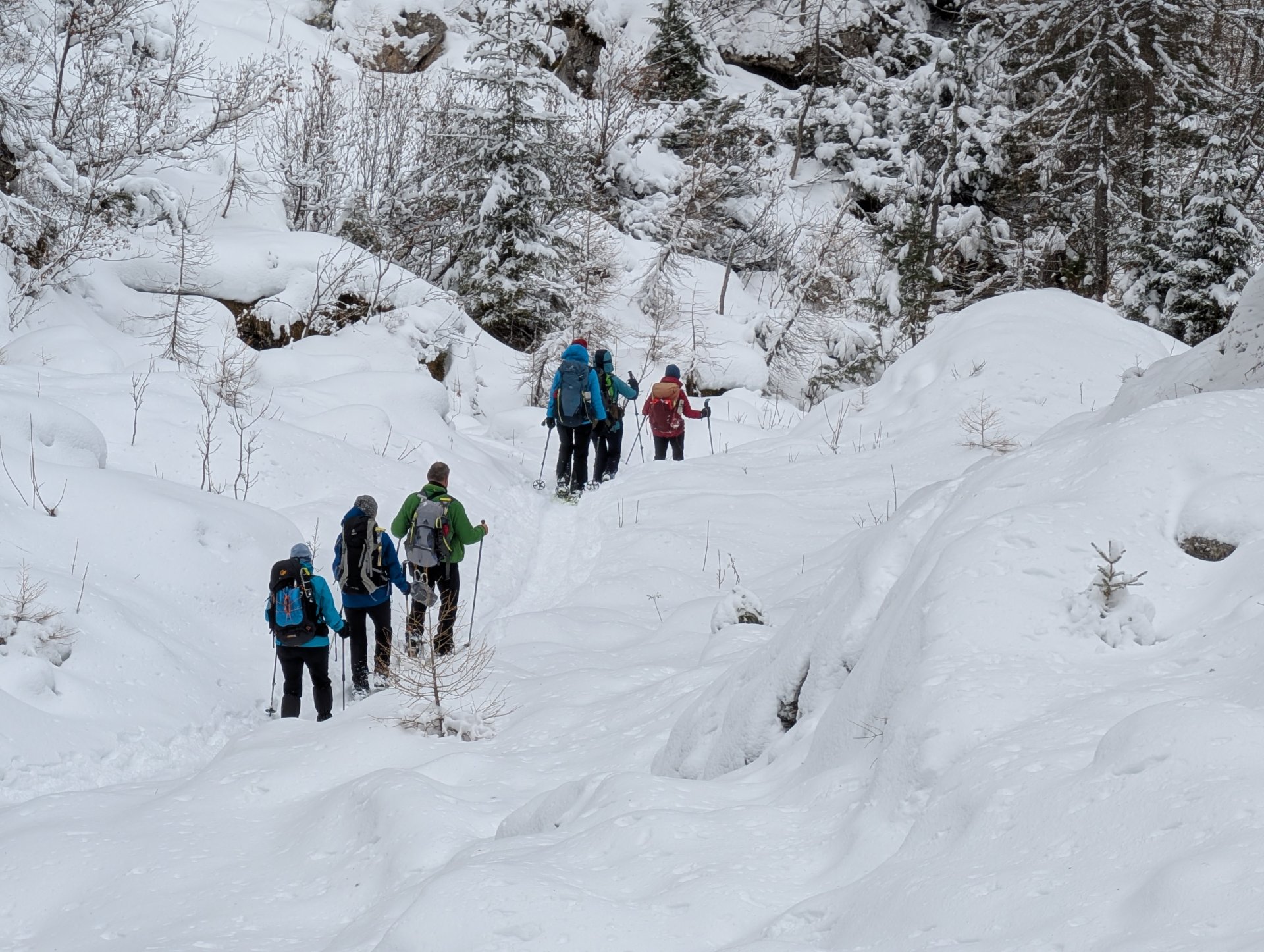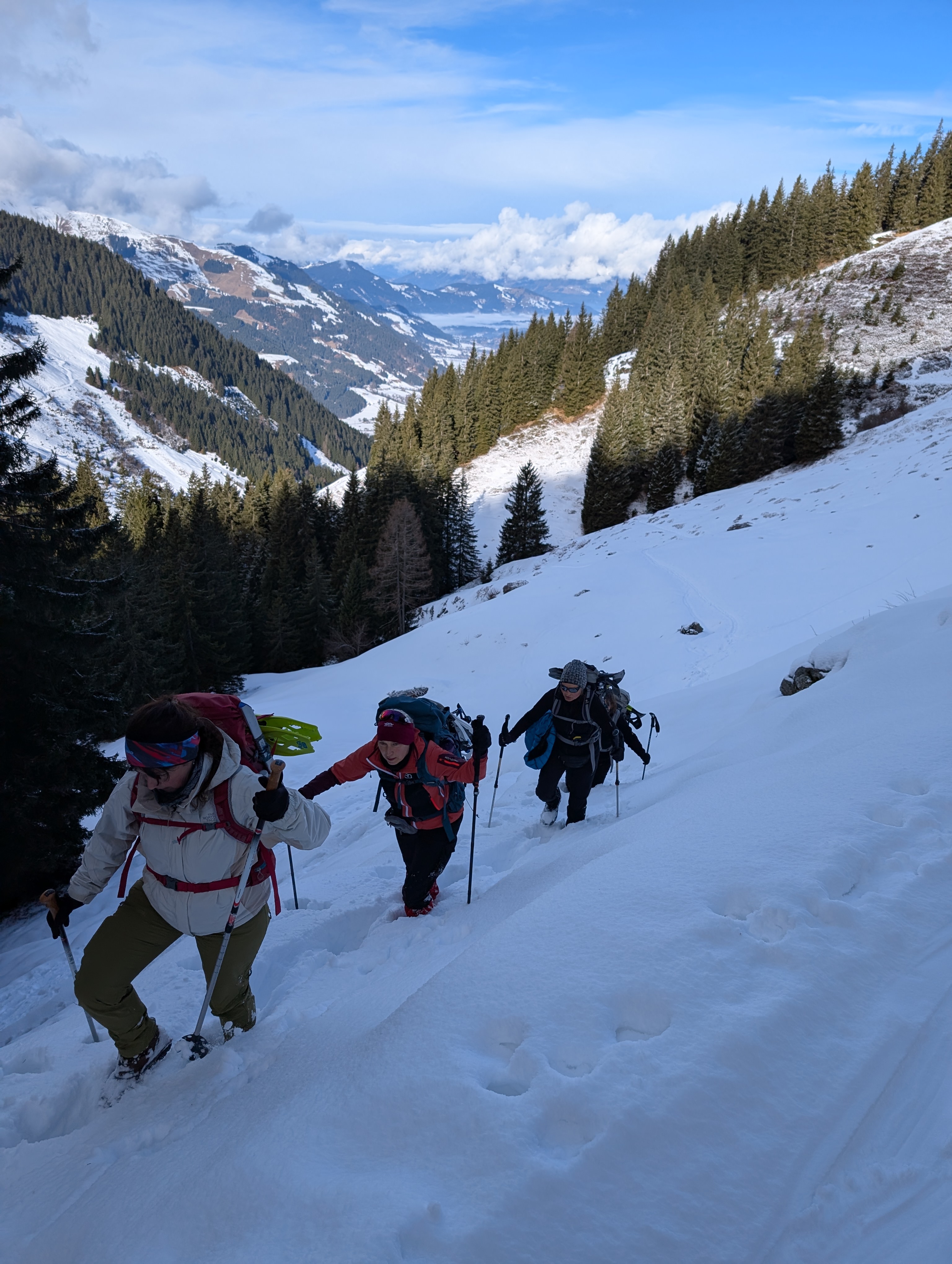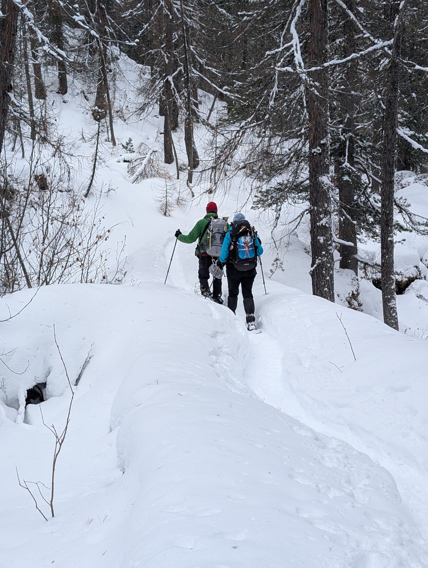 Aufgrund des kräftigen Schneefalls und der tiefen Temperaturen war die Schneeauflage bis fast zum See gut und wir konnten sehr lange die Schneeschuhe an lassen.