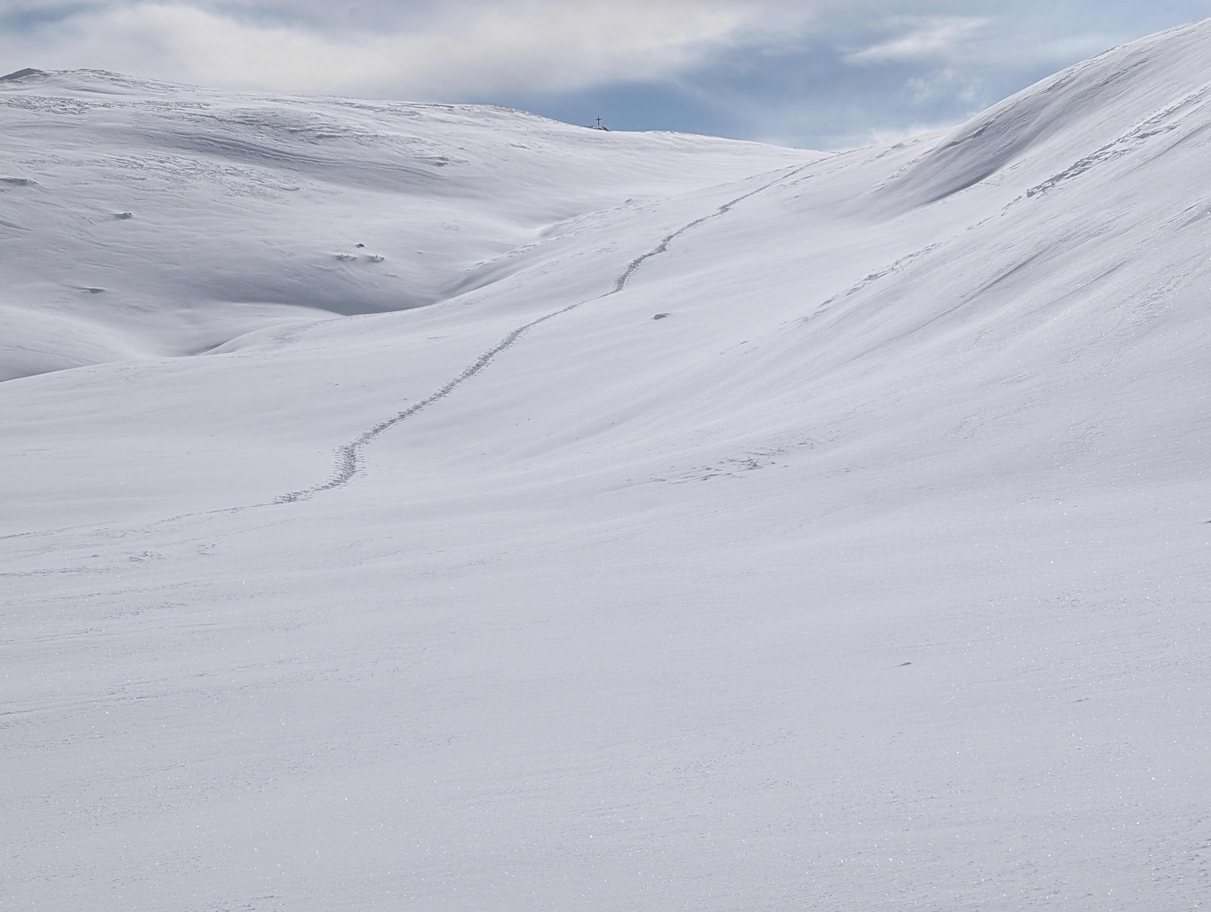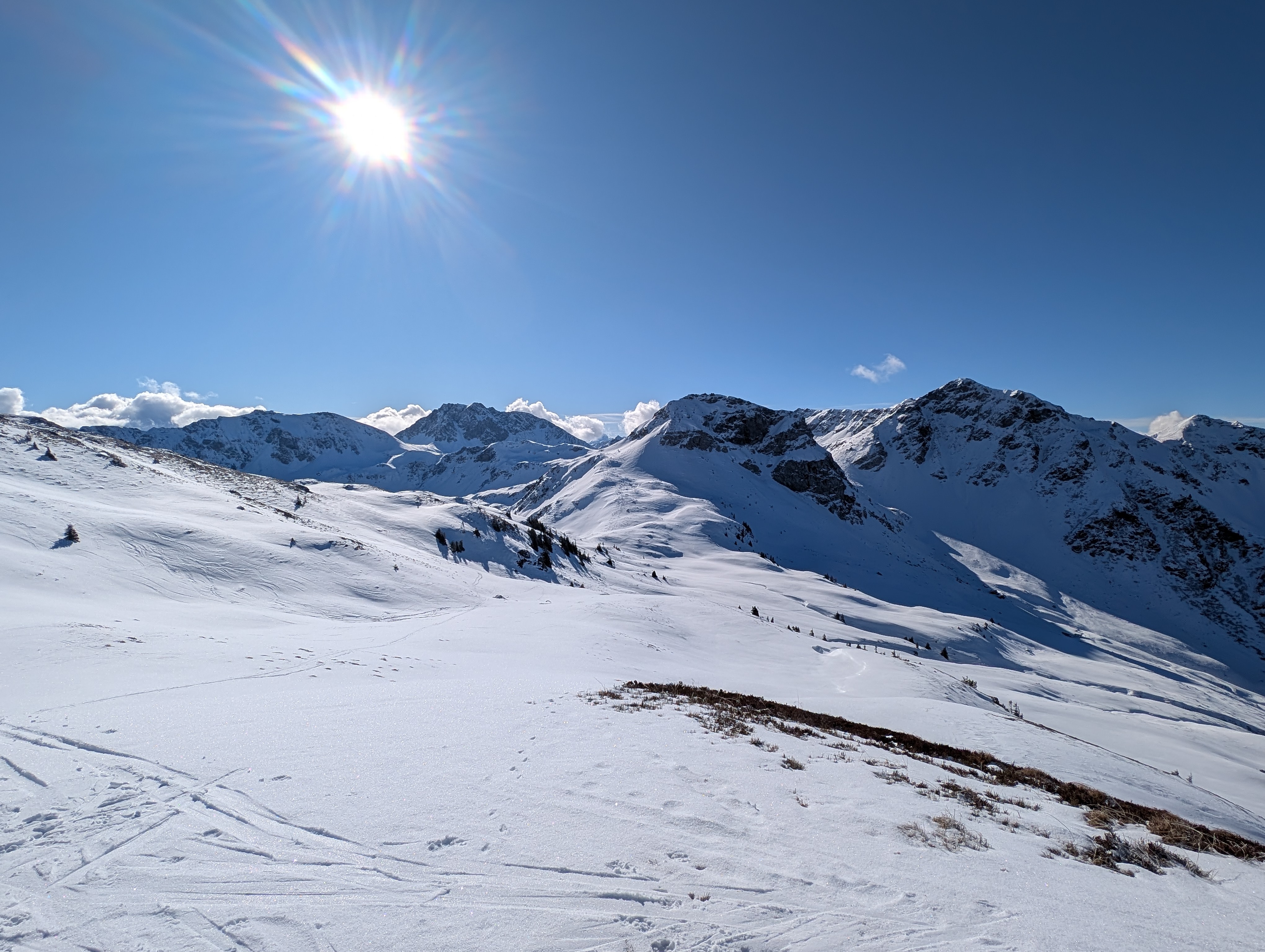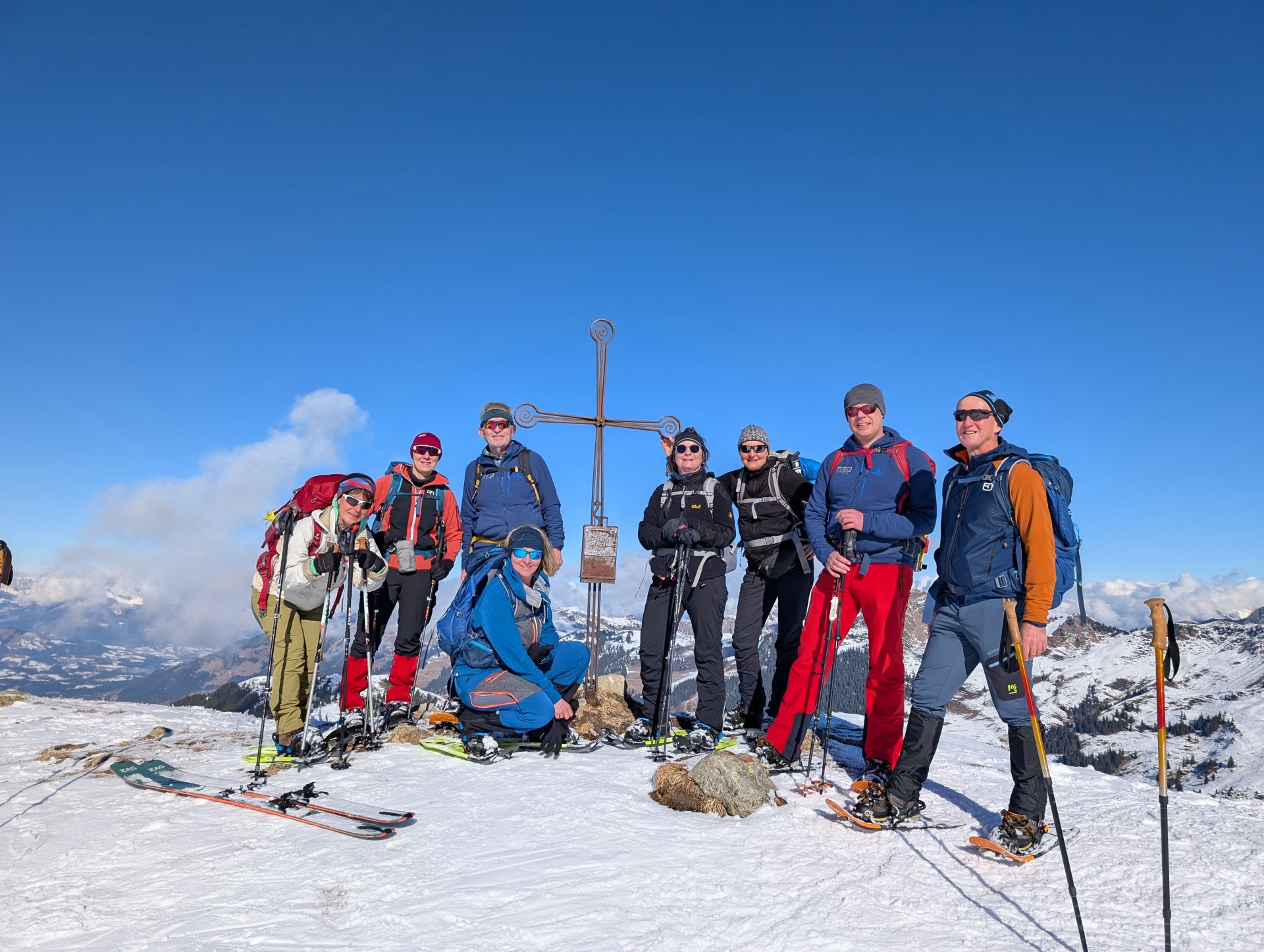 Frühstück war für 7:30 Uhr angesagt, aber dank Simone durften wir uns – so wie in den nächsten Tagen auch – mit Yoga auf die kommende Tour einstimmen. Gleich nach dem Start Richtung Niederkaseralm legten wir wieder unsere Grödel an, Schnee war weiterhin nur Dekoration, dafür gab's genug vereiste Stellen. Nach einem kurzen Steilaufstieg kamen wir aber endlich mit jetzt reichlich Schnee in Berührung. Ab der Oberkaseralm durften wir dann unverspurten Neuschnee geniessen. Am sogenannten Tor einigten wir uns nach kurzer Diskussion darauf, welcher der vielen Gipfel unser Ziel, der Mittagskogel (2038 mtr) sei, was sich dann auch als richtig herausstellte. Sonnenbrille und Sonnencreme kamen zum Einsatz, trotzdem fiel die Rast nach dem Gipfel wegen des kalten Windes relativ kurz aus. Zurück am Tor gab es dann von Simone noch eine kurze Freiluft-Yogaeinheit. Auf dem Rückweg steuerten wir unsere Hütte dann von oben an, so dass wir unsere Grödel hier nicht mehr brauchten.