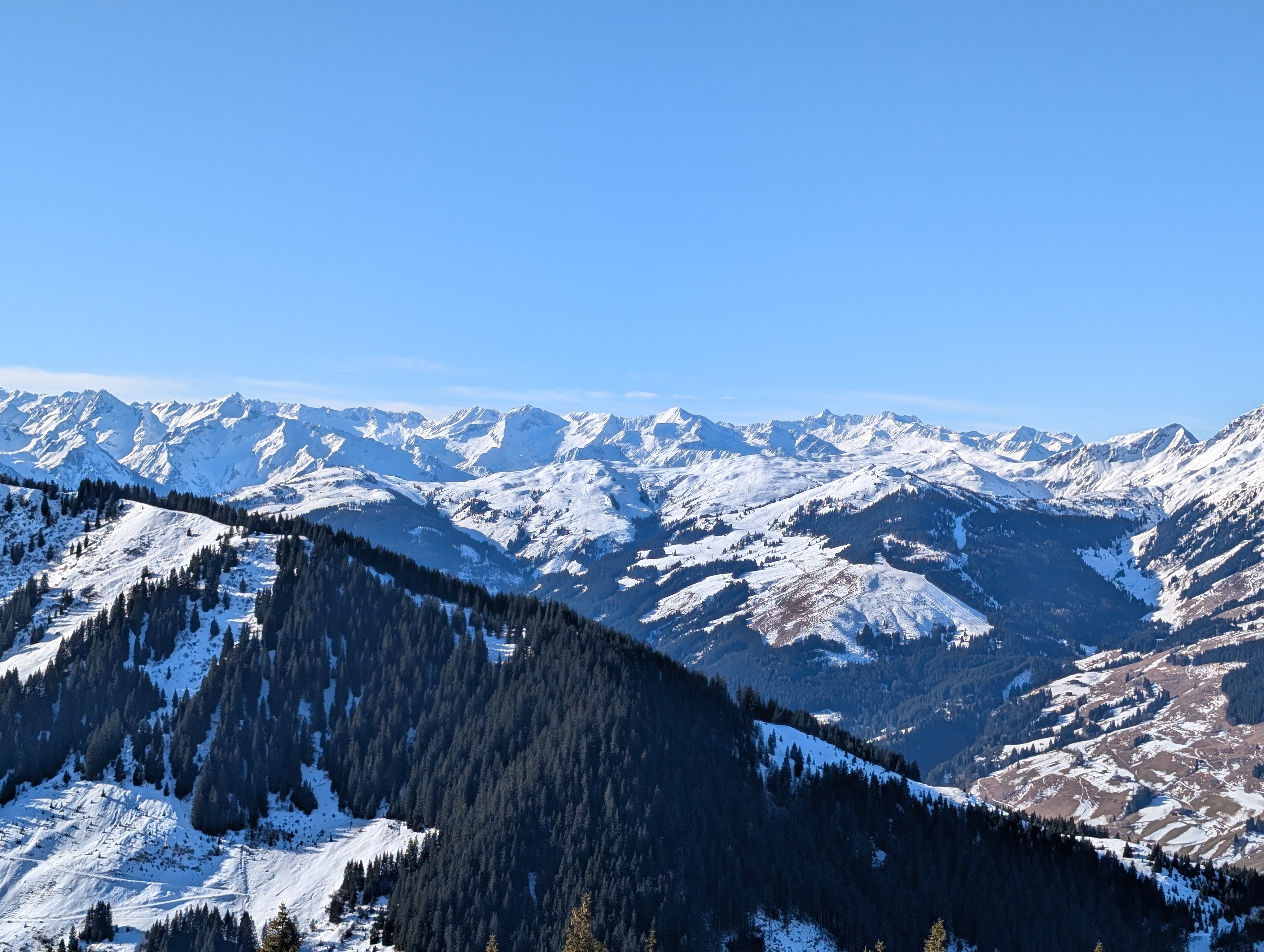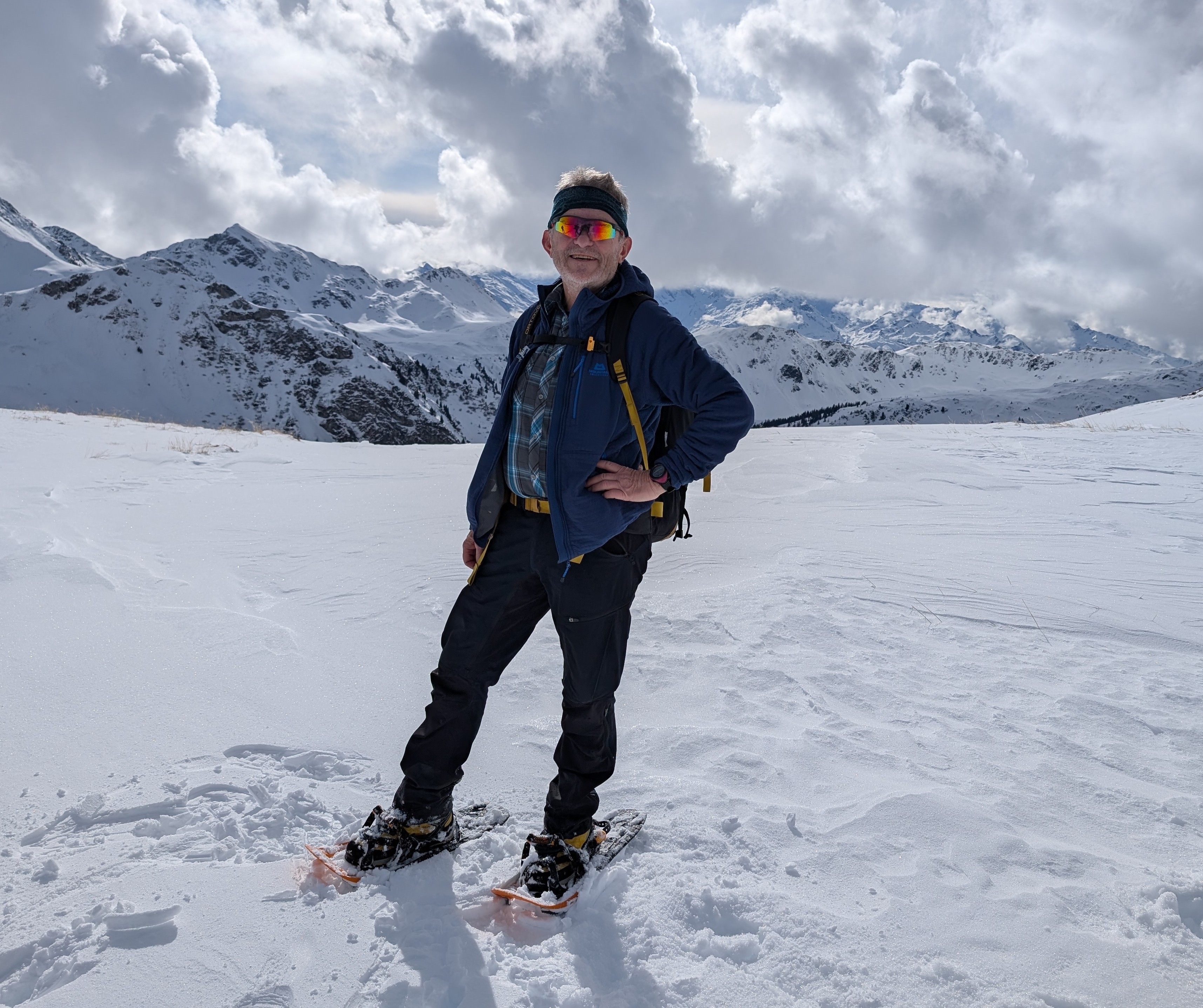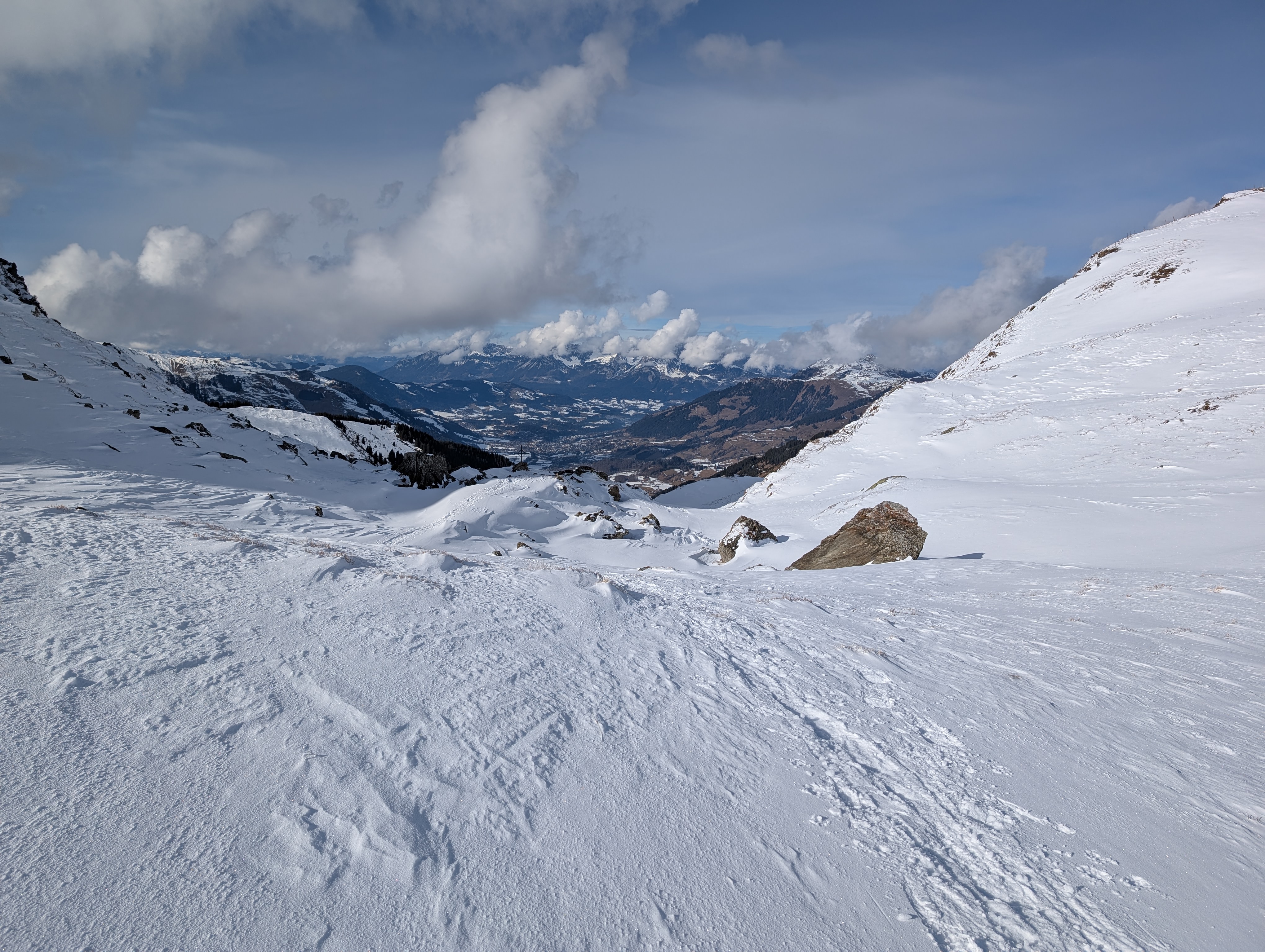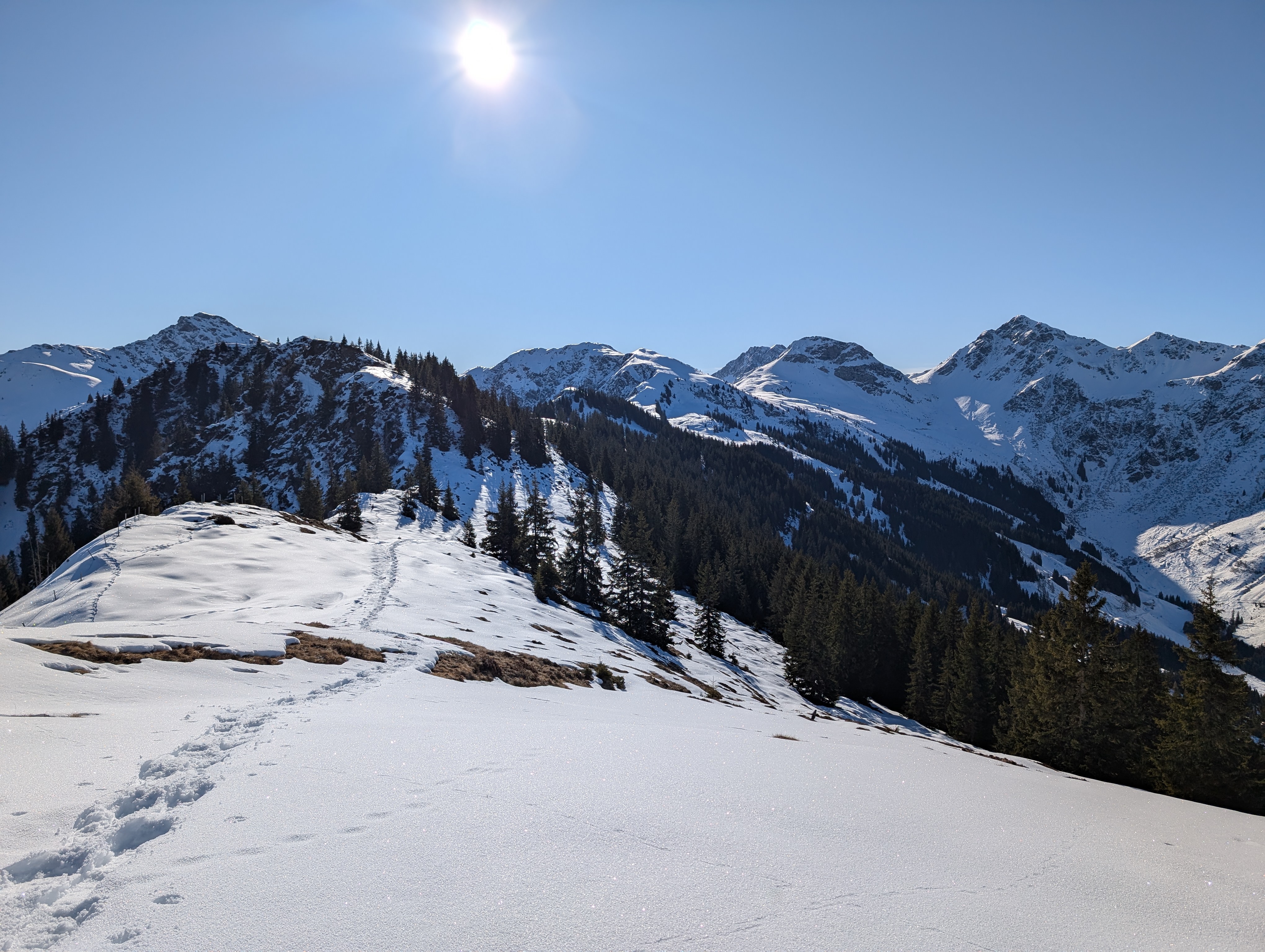 Frühstück war für 7:30 Uhr angesagt, aber dank Simone durften wir uns – so wie in den nächsten Tagen auch – mit Yoga auf die kommende Tour einstimmen. Gleich nach dem Start Richtung Niederkaseralm legten wir wieder unsere Grödel an, Schnee war weiterhin nur Dekoration, dafür gab's genug vereiste Stellen. Nach einem kurzen Steilaufstieg kamen wir aber endlich mit jetzt reichlich Schnee in Berührung. Ab der Oberkaseralm durften wir dann unverspurten Neuschnee geniessen. Am sogenannten Tor einigten wir uns nach kurzer Diskussion darauf, welcher der vielen Gipfel unser Ziel, der Mittagskogel (2038 mtr) sei, was sich dann auch als richtig herausstellte. Sonnenbrille und Sonnencreme kamen zum Einsatz, trotzdem fiel die Rast nach dem Gipfel wegen des kalten Windes relativ kurz aus. Zurück am Tor gab es dann von Simone noch eine kurze Freiluft-Yogaeinheit. Auf dem Rückweg steuerten wir unsere Hütte dann von oben an, so dass wir unsere Grödel hier nicht mehr brauchten.