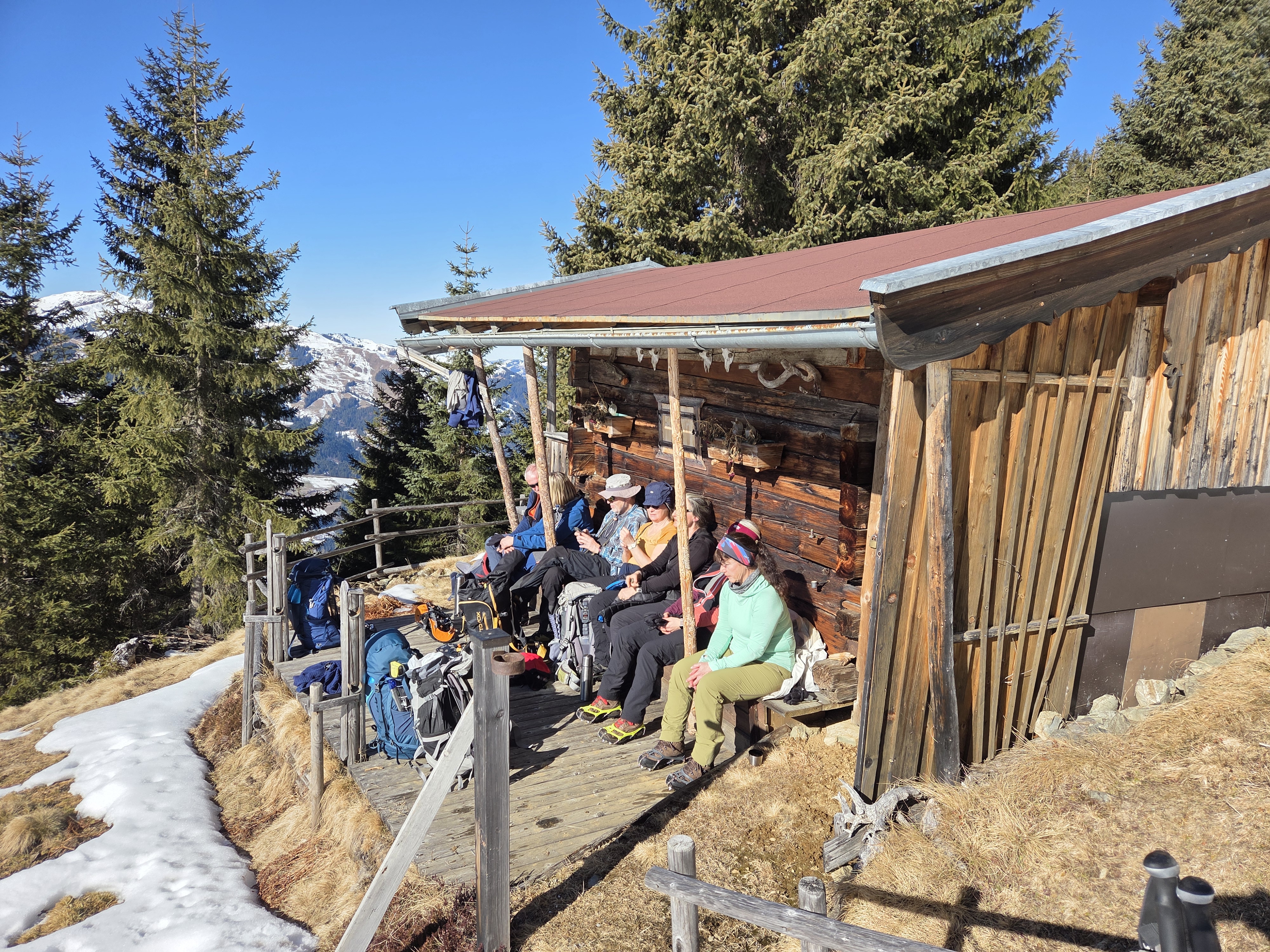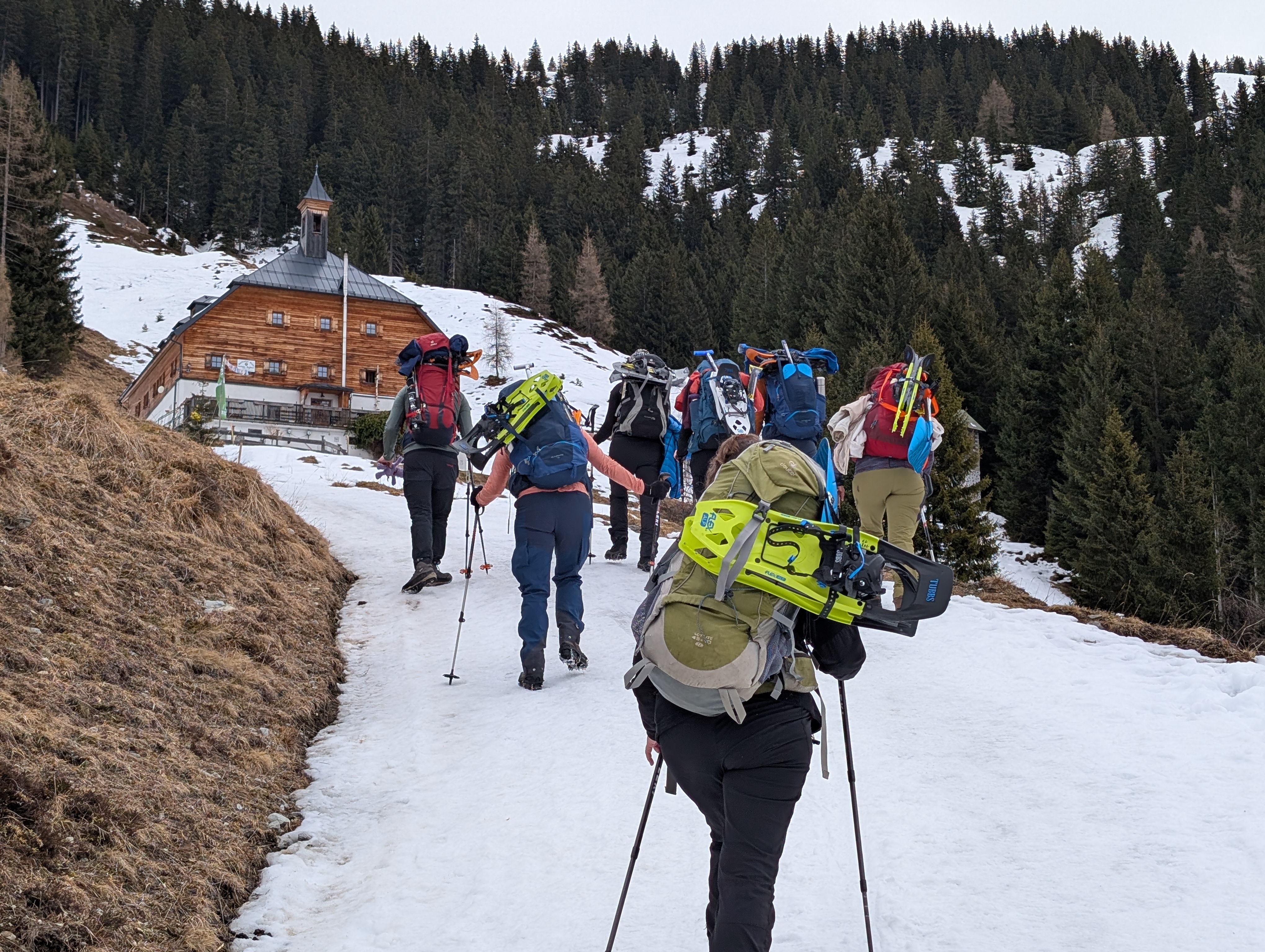 Nach (fast) pünktlichem Start um 7:45 an unserer Geschäftsstelle in Amberg traten wir die Reise für unser alpines Schneeschuhwochenende auf der Bochumer Hütte oder Kelchalm an. Natürlich wurde am Irschenberg der obligatorische Stopp zur Kaffeepause eingelegt, ohne Probleme erreichten wir dann pünktlich unseren Ausgangspunkt in Wiesenegg-Grüntal, südlich von Kitzbühel. Schnee war beim Start noch Mangelware, aber schon sehr bald kamen auf dem zum Teil spiegelglatten Zufahrtsweg unsere Grödel zum Einsatz. Nach knapp zwei Stunden erreichten wir die Kelchalm auf 1430 mtr. Zu unserer Enttäuschung war die Schneeauflage immer noch äußerst dürftig. Da wir noch genügend Zeit hatten, absolvierten wir unsere obligatorischen LVS-Übungen gleich noch am ersten Tag. Nach dem Abendessen wurden Spielkarten ausgepackt, beim Hornochsenspiel wurde gleich